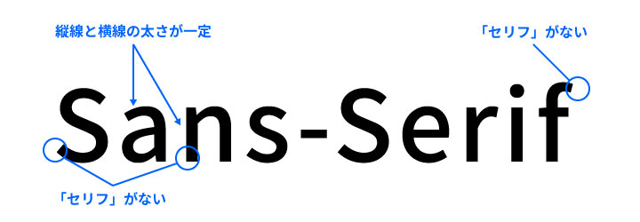 サンセリフ体は「セリフ」がないタイプの書体のことです。「sans-(サン)」とはフランス語で「無い」という意味で、「sans-serif」は「セリフがない」書体ということになります。