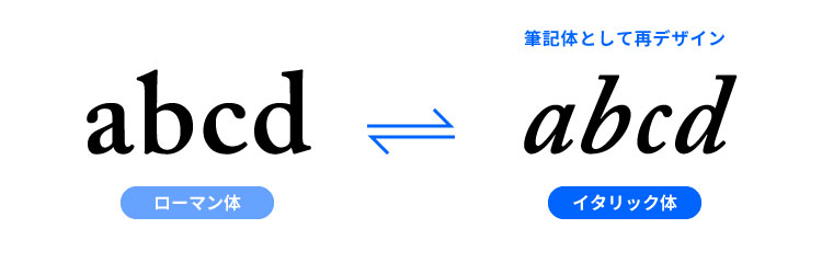 イタリック体とは、単に文字を斜めにしたものではなく、斜体専用に文字自体をデザインし直して美しく傾けた書体のことです。イタリックとは、「斜体」を表す言葉ではなくて、欧文書体の手書き文字をもとにしたスタイル、つまり「筆記体」を意味します。文字が斜めに傾いているのは、文字を手で書いたときの傾きをそのまま書体のデザイン反映しているからなのです。