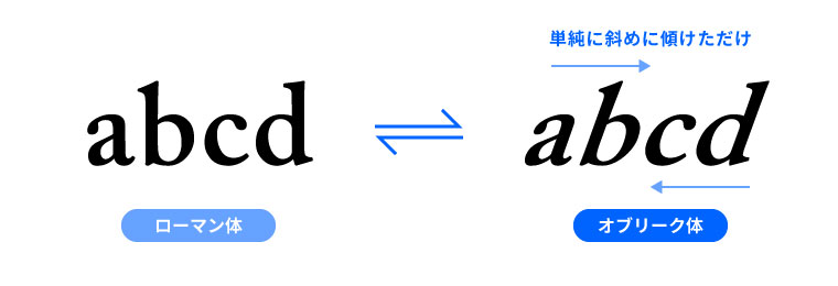 オブリーク体は、通常の直立体(ローマン体)を単純に斜めに傾けたもので、デザイン上の調整が加えられていないため、文字の形状自体は直立のまま単純に斜めになっています。そのため、字の形に微妙な歪みや違和感が生じてしまっている場合があります。