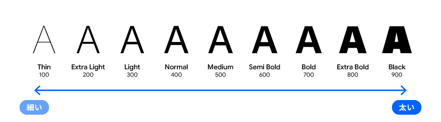 フォントには同じ書体でも太さの違いがあり、これをウェイト(Weight)と呼びます。極細のものから極太のものまで何段階もの太さのバリエーションがある書体もあり、ウェイトは数値や名前で表現されます。CSSでフォントの太さを調整するプロパティにfont-weightプロパティがあり、値には数値やキーワードを指定することができます。