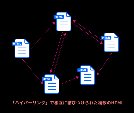HTMLはハイパーリンクよってインターネット上に分散して存在するテキストドキュメントを互いに参照することで関連づけられ、リンクをたどりながら情報を得ることができる仕組みになっています。今では当たり前の機能ですが、ハイパーテキストの仕組みはWebを支える根幹技術の一つといえます。