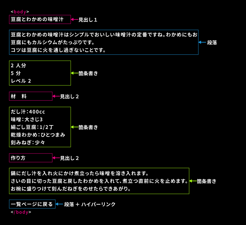 この文章を人間が読んだ場合、単語の意味、文法、改行に位置などから、どの部分が見出し(タイトル)でどの部分が箇条書き(リスト)であるのかを判断し情報の意味や文章の役割(構造)が理解できます。しかしコンピュータから見ると、文章の意味や役割、改行も理解できないため、この文章はただのひと続きのテキストの連なりでしかありません。この文章を Webブラウザで見てみると次のように見えます。