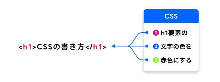 「h1要素」の「文字色」を「赤色に」するという、「どこの・なにを・どのように」という形を書式化したものがCSSの基本的な書き方になります。
