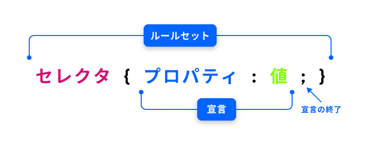 「セレクタ・プロパティ・値」までの一式を「ルールセット」と呼びます。波括弧のプロパティと値がまとまった部分を「宣言」と呼びます。