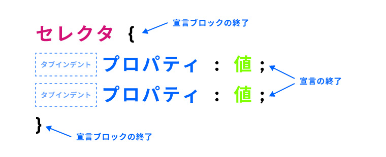 まず、セレクタは何にも囲まず先頭に書きます。それに続けてプロパティと値は「{}(波括弧)」で囲います。波括弧の中のプロパティと値は「:(コロン)」でつなぎ、この2つは常にセット使用します。このような書式で「セレクタ・プロパティ・値」を設定することにより「どこの・なにを・どのように」見た目に変えるのかを指定することができます。